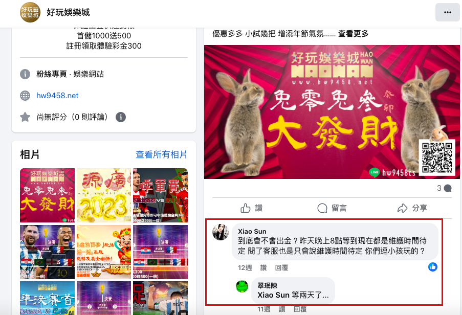 才剛說完好玩娛樂城可能是詐騙的疑慮,馬上又被小編找到一個鐵錚錚的可疑案例,圖中可以看到有網友在JE娛樂城前身:好玩娛樂城臉書貼文留言:「從昨天晚上八點等到現在都不回覆是否出金,一直說正在維護,維護時間待定」,後面還有一位網友也跟著留言說他申請出金已經等了兩天還沒收到款項。